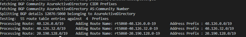 There are a few sections where you can uncomment output detail lines and so forth. The script is set to use Azure BGP Community routes with “AzureActiveDirectory” left in the script by default.