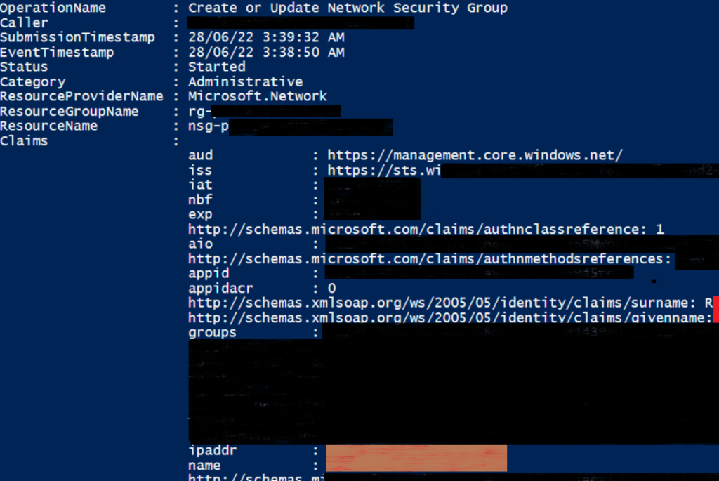Originally I tried Format-Table to nicely display data, however I decided to bind together data from two separate sets of data collections so that I could present the actual user name & IP Address of the person carrying out the action. The issue here was that this data is contained within one of the fields in the Get-AzLog output with it’s own set of keys and value pairs. In order to solve this I referenced a reddit post! https://www.reddit.com/r/PowerShell/comments/62gcdn/combining_two_ps_object_values/ I used the code in this post to merge my two sets of data together and the export-csv the data to a file, I wouldn’t expect the data volumes to be so large to exhaust memory but I imagine my script could be refined to process the data differently or I could simply drop the extract of username and IP Address considering I already have a “Caller” field with some data.