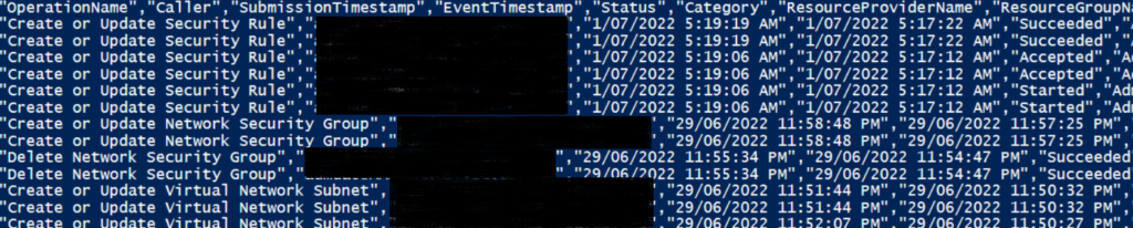 In my earlier posts I’ve focused on scripts that grab slabs of Powershell output information about Resources to run differential checks against them for the most part in order to see what’s changed for documentation purposes or change control or have historical record of configuration changes for Audit trail and troubleshooting. I’ve now put together a short script using the “Get-AzLog” function to pull out specific activity logs from Azure to see into CRUD activity focusing as the Resource Group for the context. A specific set of fields is focused on for output data to give at bit of an at a glance view in basic CSV form.